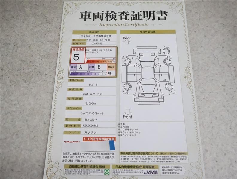 詳細及び現状の車両状態につきましては、店舗スタッフまでお尋ねください。 - 注2)上記と同様の評価点・状態表を「車両検査証明書」として店舗の展示車両に搭載しております。