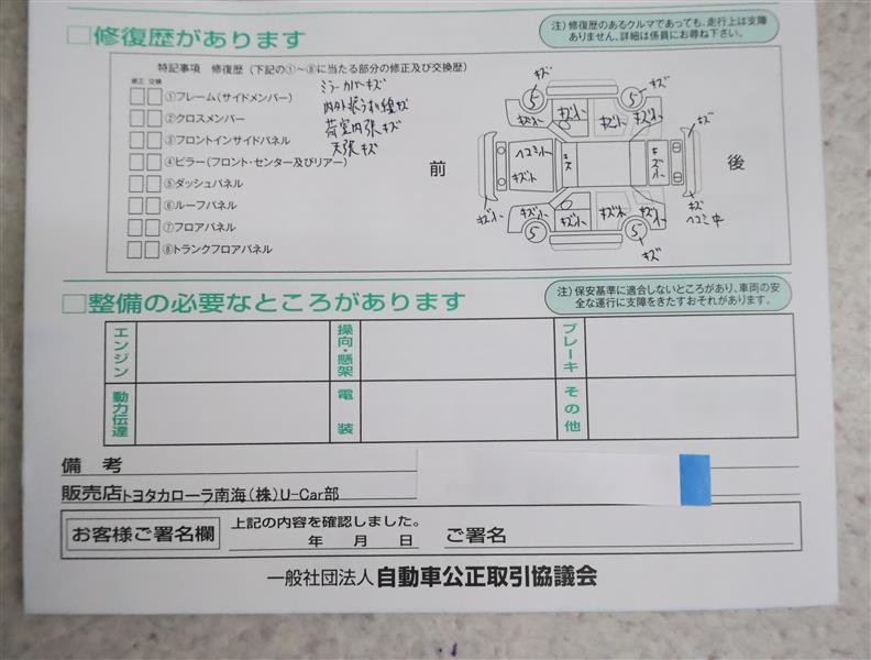 - 「修復歴あり」の場合、修復部位の詳細につきましては、販売店へお問合せください。