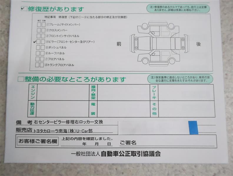- 「定期点検整備なし(要整備箇所あり)」の場合、整備箇所につきましては、販売店へお問合せください。