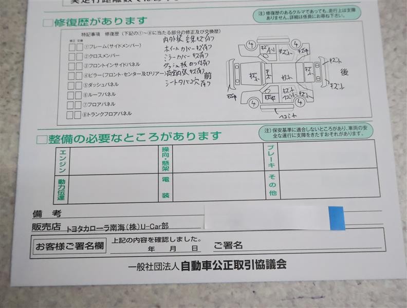 - 「定期点検整備なし(要整備箇所あり)」の場合、整備箇所につきましては、販売店へお問合せください。