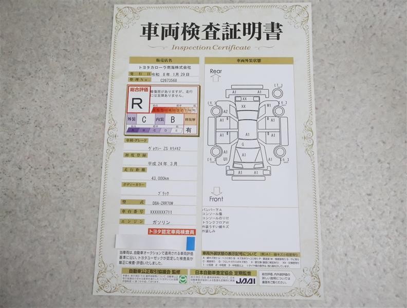 詳細及び現状の車両状態につきましては、店舗スタッフまでお尋ねください。 - 注2)上記と同様の評価点・状態表を「車両検査証明書」として店舗の展示車両に搭載しております。