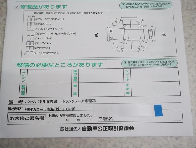 - 「修復歴あり」の場合、修復部位の詳細につきましては、販売店へお問合せください。