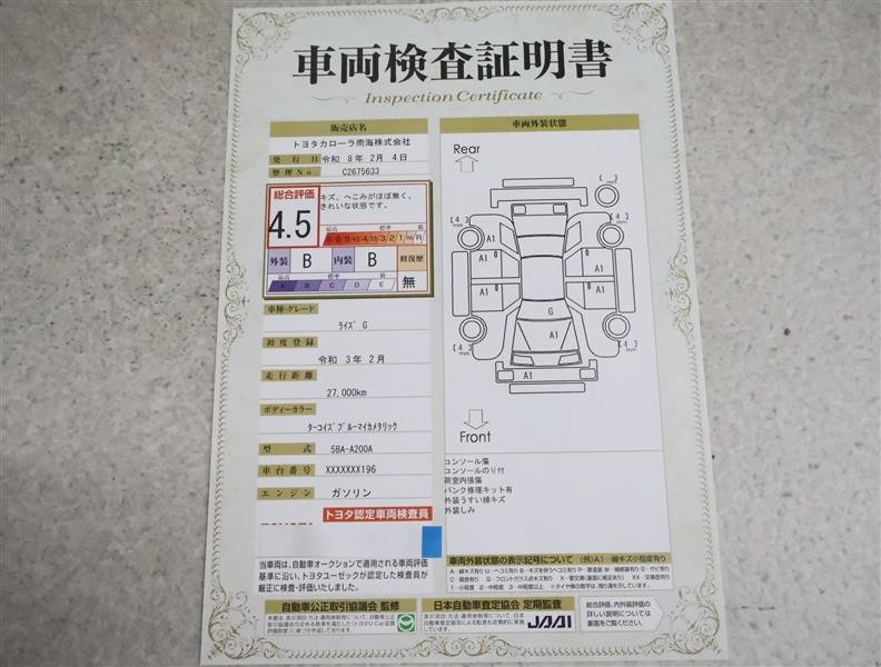 詳細及び現状の車両状態につきましては、店舗スタッフまでお尋ねください。 - 注2)上記と同様の評価点・状態表を「車両検査証明書」として店舗の展示車両に搭載しております。