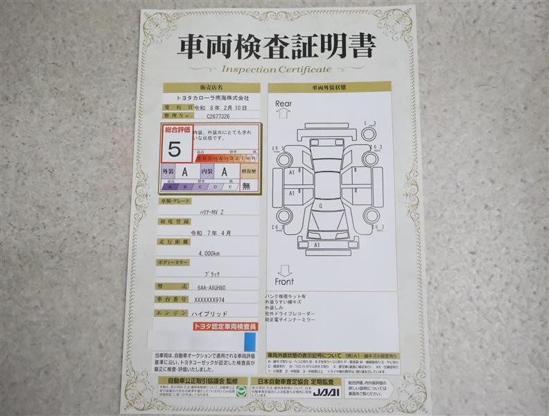 詳細及び現状の車両状態につきましては、店舗スタッフまでお尋ねください。 - 注2)上記と同様の評価点・状態表を「車両検査証明書」として店舗の展示車両に搭載しております。