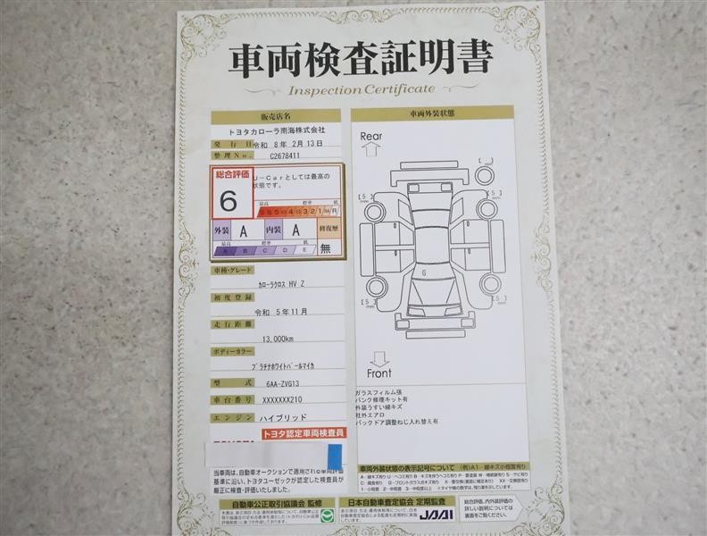 | 総合評価 | 6 | U-Carとしては最高の状態です。(新車登録後3年未満、走行距離3万キロ以内で、中古車としては最高の状態です。) | ![]() |