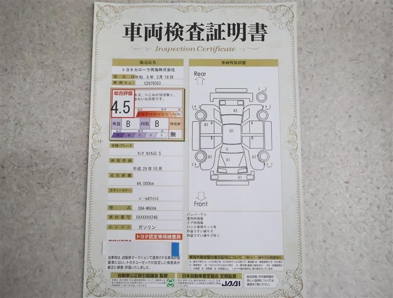 詳細及び現状の車両状態につきましては、店舗スタッフまでお尋ねください。 - 注2)上記と同様の評価点・状態表を「車両検査証明書」として店舗の展示車両に搭載しております。
