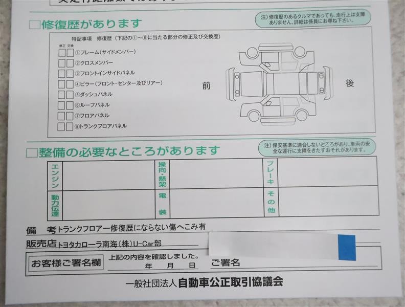 - 「修復歴あり」の場合、修復部位の詳細につきましては、販売店へお問合せください。