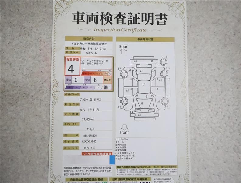 詳細及び現状の車両状態につきましては、店舗スタッフまでお尋ねください。 - 注2)上記と同様の評価点・状態表を「車両検査証明書」として店舗の展示車両に搭載しております。