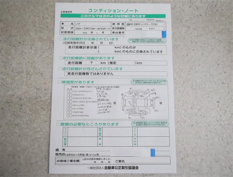 - 「定期点検整備なし(要整備箇所あり)」の場合、整備箇所につきましては、販売店へお問合せください。