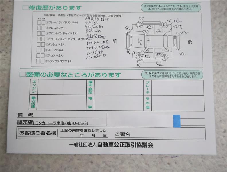 - 「修復歴あり」の場合、修復部位の詳細につきましては、販売店へお問合せください。