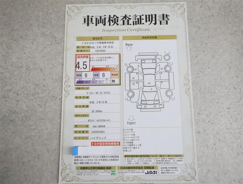 詳細及び現状の車両状態につきましては、店舗スタッフまでお尋ねください。 - 注2)上記と同様の評価点・状態表を「車両検査証明書」として店舗の展示車両に搭載しております。