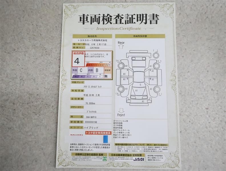 詳細及び現状の車両状態につきましては、店舗スタッフまでお尋ねください。 - 注2)上記と同様の評価点・状態表を「車両検査証明書」として店舗の展示車両に搭載しております。