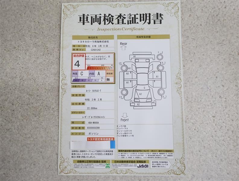 詳細及び現状の車両状態につきましては、店舗スタッフまでお尋ねください。 - 注2)上記と同様の評価点・状態表を「車両検査証明書」として店舗の展示車両に搭載しております。