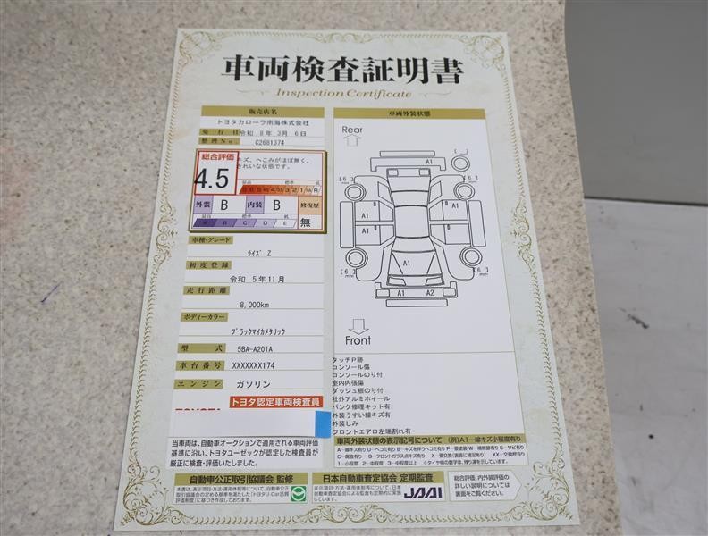 詳細及び現状の車両状態につきましては、店舗スタッフまでお尋ねください。 - 注2)上記と同様の評価点・状態表を「車両検査証明書」として店舗の展示車両に搭載しております。