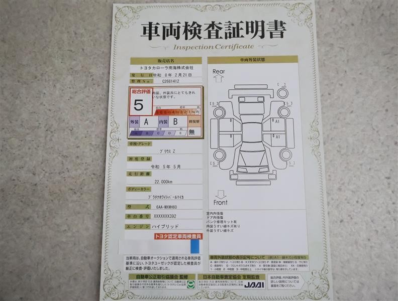 詳細及び現状の車両状態につきましては、店舗スタッフまでお尋ねください。 - 注2)上記と同様の評価点・状態表を「車両検査証明書」として店舗の展示車両に搭載しております。