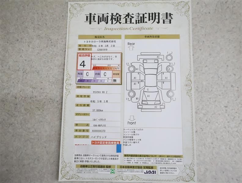 詳細及び現状の車両状態につきましては、店舗スタッフまでお尋ねください。 - 注2)上記と同様の評価点・状態表を「車両検査証明書」として店舗の展示車両に搭載しております。