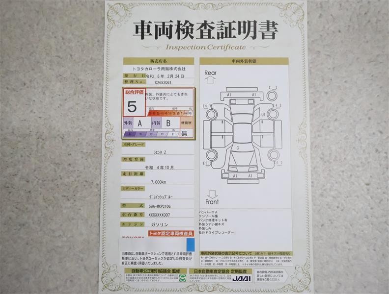 詳細及び現状の車両状態につきましては、店舗スタッフまでお尋ねください。 - 注2)上記と同様の評価点・状態表を「車両検査証明書」として店舗の展示車両に搭載しております。