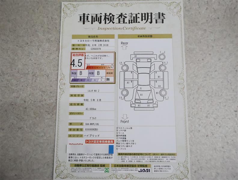 詳細及び現状の車両状態につきましては、店舗スタッフまでお尋ねください。 - 注2)上記と同様の評価点・状態表を「車両検査証明書」として店舗の展示車両に搭載しております。
