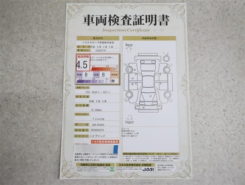 詳細及び現状の車両状態につきましては、店舗スタッフまでお尋ねください。 - 注2)上記と同様の評価点・状態表を「車両検査証明書」として店舗の展示車両に搭載しております。