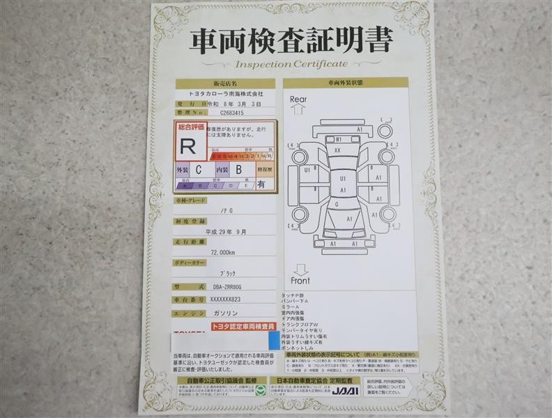 詳細及び現状の車両状態につきましては、店舗スタッフまでお尋ねください。 - 注2)上記と同様の評価点・状態表を「車両検査証明書」として店舗の展示車両に搭載しております。