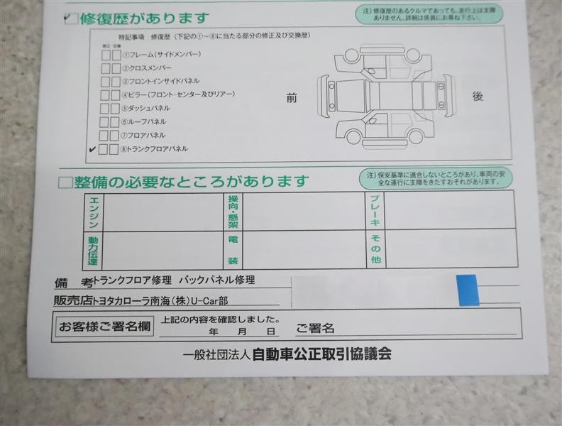- 「修復歴あり」の場合、修復部位の詳細につきましては、販売店へお問合せください。
