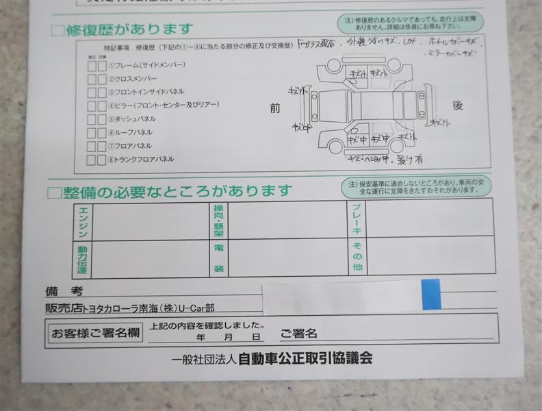 - 「修復歴あり」の場合、修復部位の詳細につきましては、販売店へお問合せください。