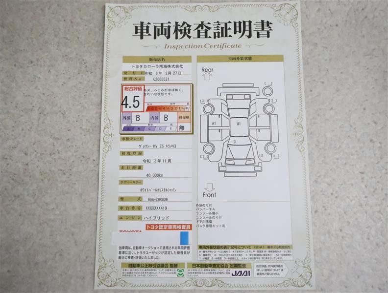 詳細及び現状の車両状態につきましては、店舗スタッフまでお尋ねください。 - 注2)上記と同様の評価点・状態表を「車両検査証明書」として店舗の展示車両に搭載しております。