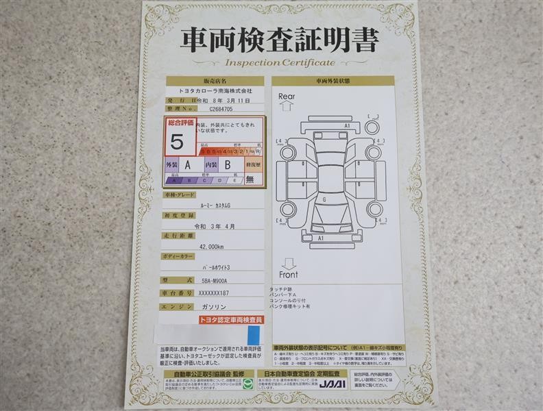 詳細及び現状の車両状態につきましては、店舗スタッフまでお尋ねください。 - 注2)上記と同様の評価点・状態表を「車両検査証明書」として店舗の展示車両に搭載しております。