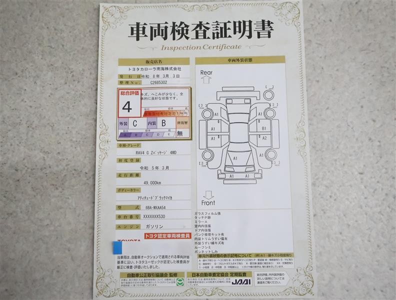 詳細及び現状の車両状態につきましては、店舗スタッフまでお尋ねください。 - 注2)上記と同様の評価点・状態表を「車両検査証明書」として店舗の展示車両に搭載しております。