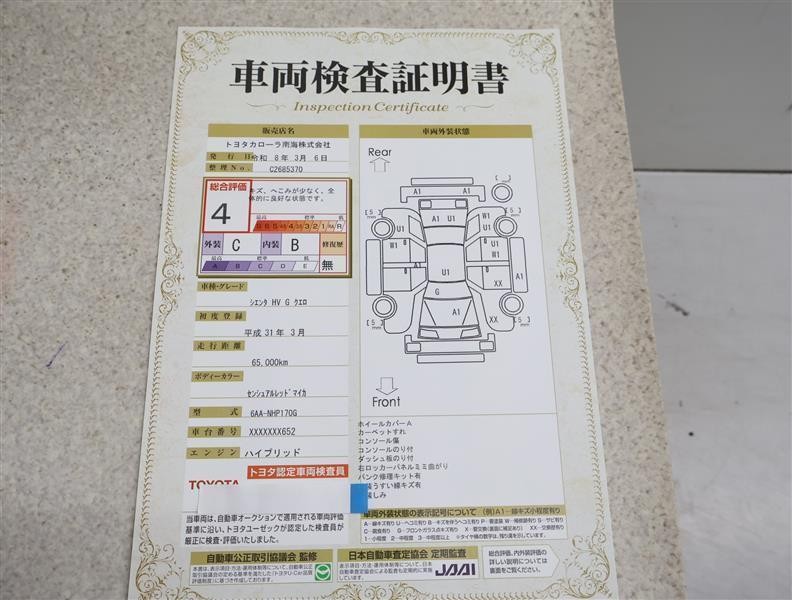 詳細及び現状の車両状態につきましては、店舗スタッフまでお尋ねください。 - 注2)上記と同様の評価点・状態表を「車両検査証明書」として店舗の展示車両に搭載しております。