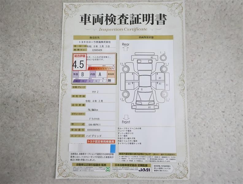 詳細及び現状の車両状態につきましては、店舗スタッフまでお尋ねください。 - 注2)上記と同様の評価点・状態表を「車両検査証明書」として店舗の展示車両に搭載しております。