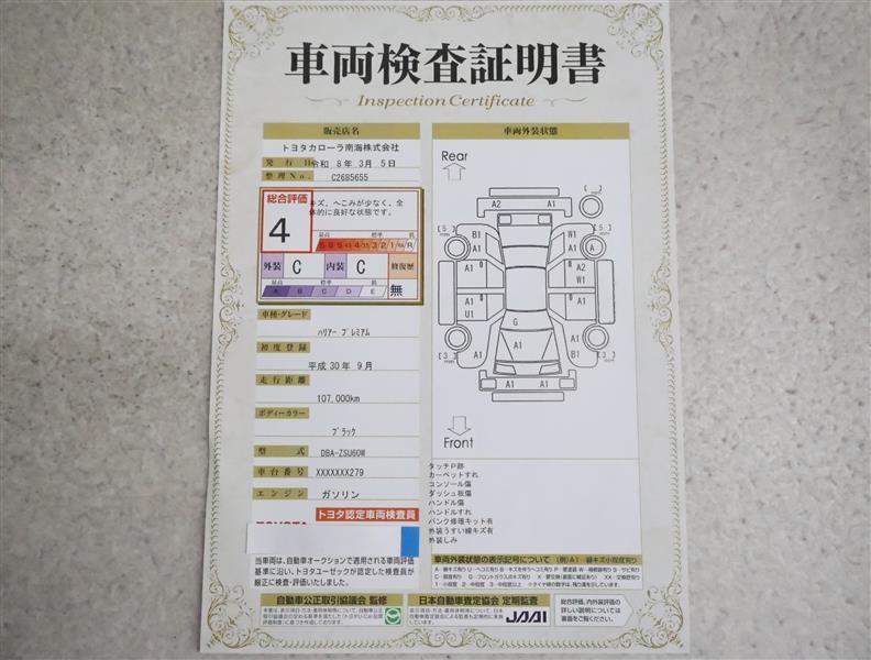 詳細及び現状の車両状態につきましては、店舗スタッフまでお尋ねください。 - 注2)上記と同様の評価点・状態表を「車両検査証明書」として店舗の展示車両に搭載しております。