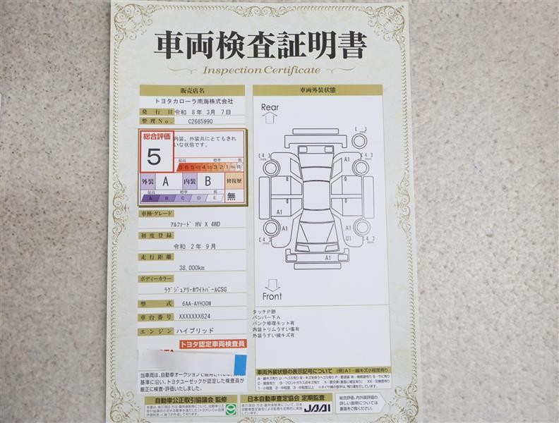 詳細及び現状の車両状態につきましては、店舗スタッフまでお尋ねください。 - 注2)上記と同様の評価点・状態表を「車両検査証明書」として店舗の展示車両に搭載しております。