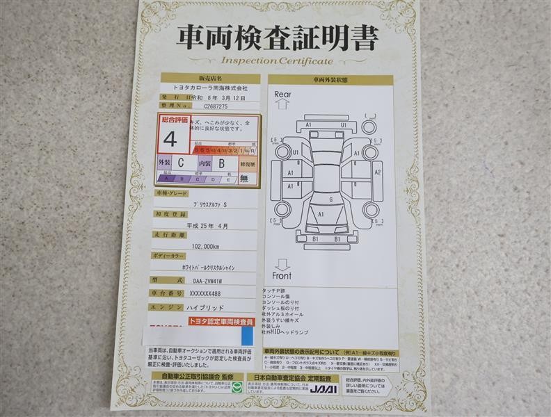 | ボディカラー | ホワイトパールクリスタルシャイン | 修復歴 | なし |