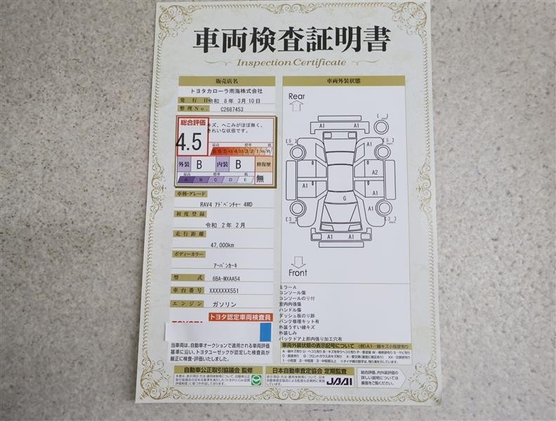 詳細及び現状の車両状態につきましては、店舗スタッフまでお尋ねください。 - 注2)上記と同様の評価点・状態表を「車両検査証明書」として店舗の展示車両に搭載しております。