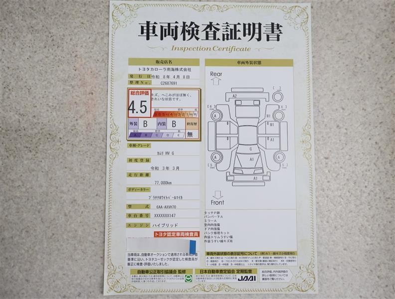 詳細及び現状の車両状態につきましては、店舗スタッフまでお尋ねください。 - 注2)上記と同様の評価点・状態表を「車両検査証明書」として店舗の展示車両に搭載しております。