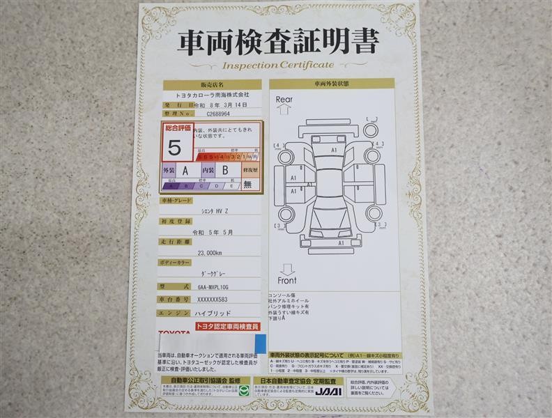 上記と同様の評価点・状態表を「車両検査証明書」として店舗の展示車両に搭載しております。