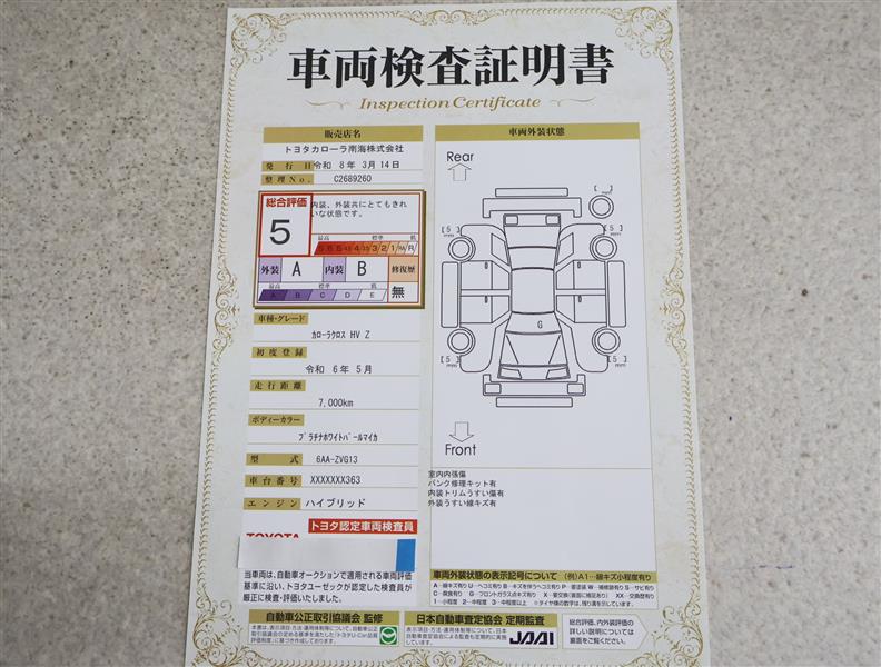 詳細及び現状の車両状態につきましては、店舗スタッフまでお尋ねください。 - 注2)上記と同様の評価点・状態表を「車両検査証明書」として店舗の展示車両に搭載しております。