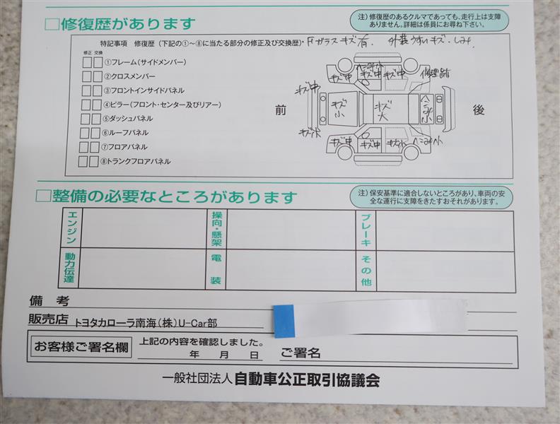 - 「修復歴あり」の場合、修復部位の詳細につきましては、販売店へお問合せください。