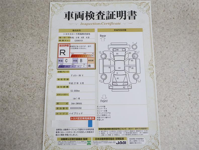 詳細及び現状の車両状態につきましては、店舗スタッフまでお尋ねください。 - 注2)上記と同様の評価点・状態表を「車両検査証明書」として店舗の展示車両に搭載しております。