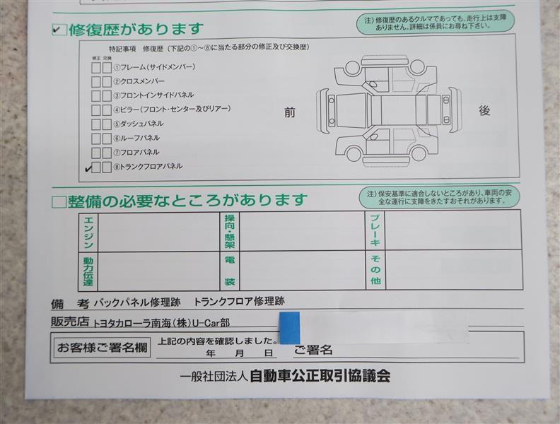 - 「修復歴あり」の場合、修復部位の詳細につきましては、販売店へお問合せください。