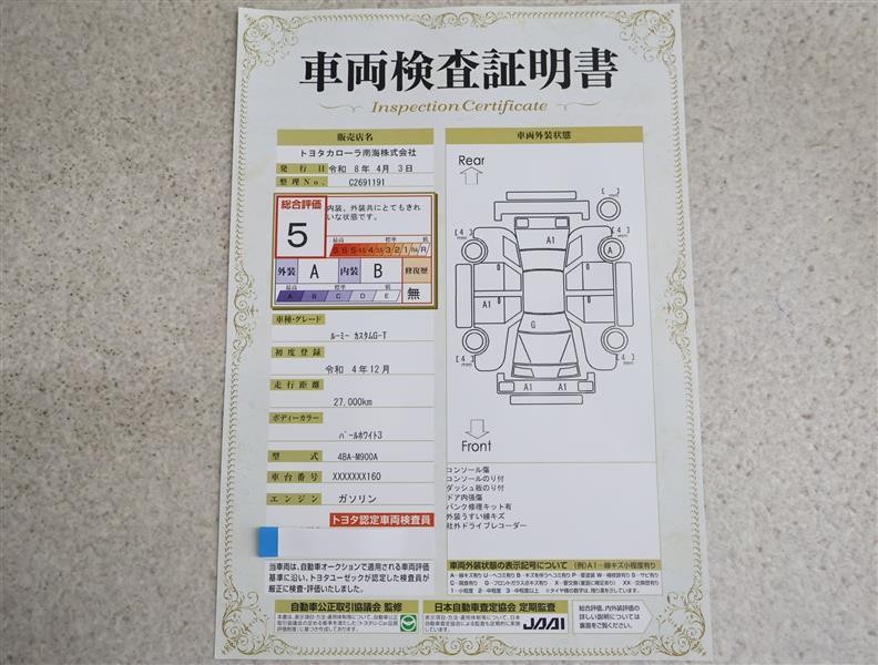 詳細及び現状の車両状態につきましては、店舗スタッフまでお尋ねください。 - 注2)上記と同様の評価点・状態表を「車両検査証明書」として店舗の展示車両に搭載しております。