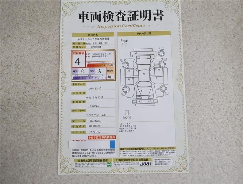 詳細及び現状の車両状態につきましては、店舗スタッフまでお尋ねください。 - 注2)上記と同様の評価点・状態表を「車両検査証明書」として店舗の展示車両に搭載しております。