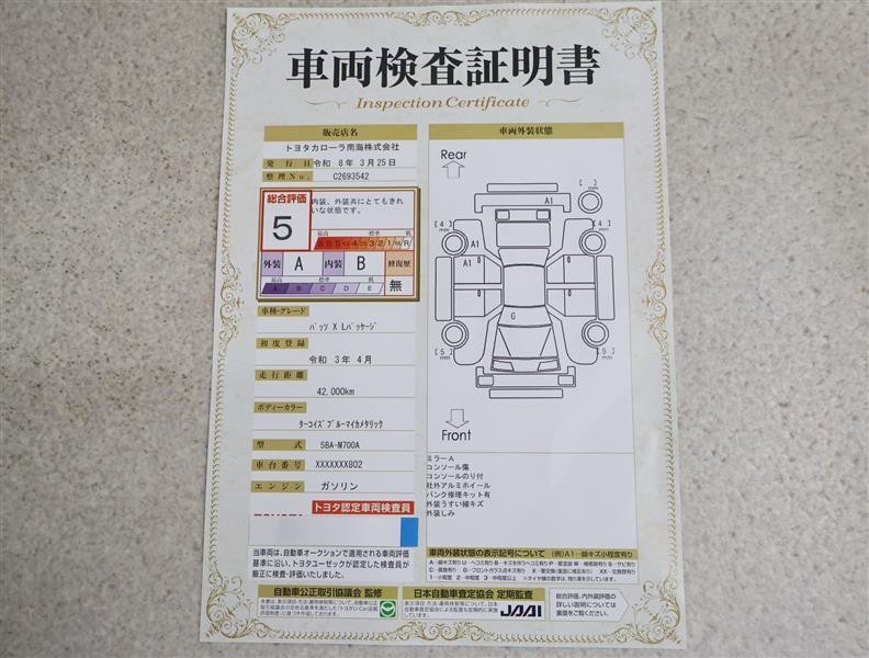 詳細及び現状の車両状態につきましては、店舗スタッフまでお尋ねください。 - 注2)上記と同様の評価点・状態表を「車両検査証明書」として店舗の展示車両に搭載しております。
