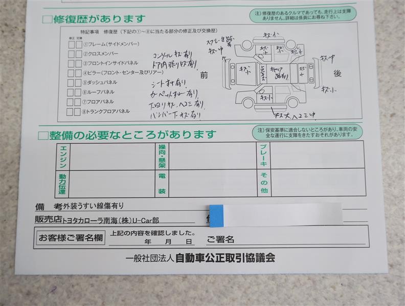 - 「修復歴あり」の場合、修復部位の詳細につきましては、販売店へお問合せください。