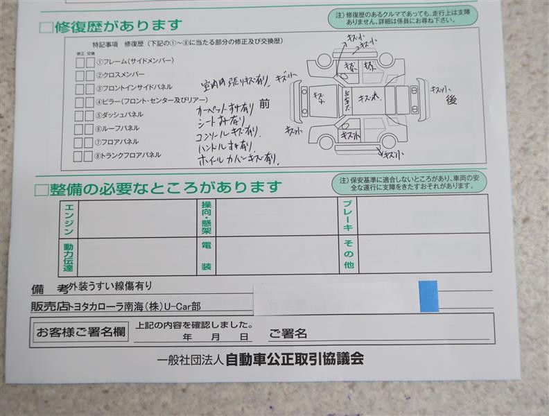 - 「修復歴あり」の場合、修復部位の詳細につきましては、販売店へお問合せください。