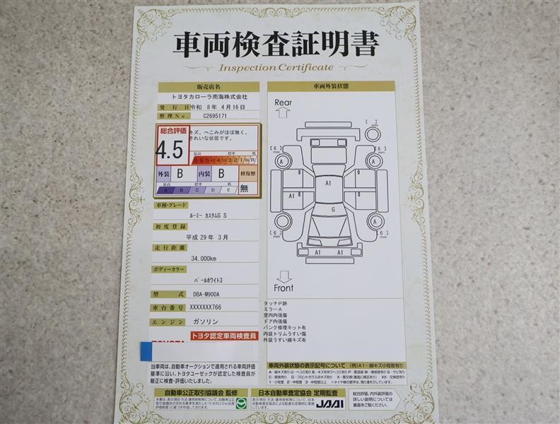 上記と同様の評価点・状態表を「車両検査証明書」として店舗の展示車両に搭載しております。