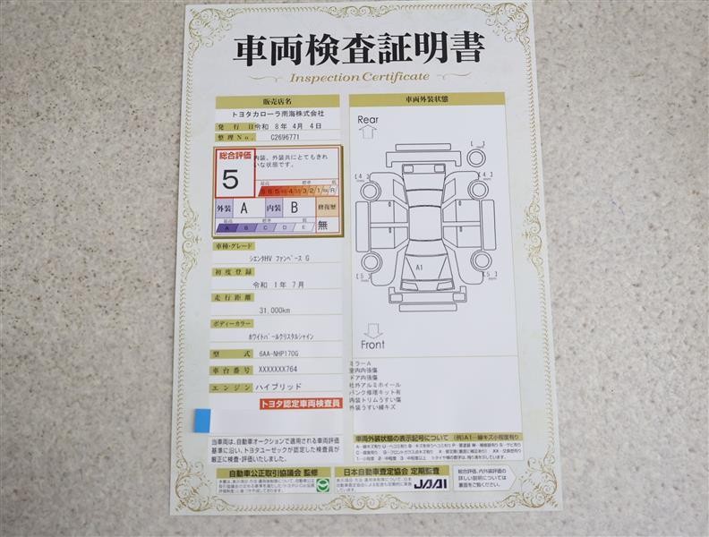 詳細及び現状の車両状態につきましては、店舗スタッフまでお尋ねください。 - 注2)上記と同様の評価点・状態表を「車両検査証明書」として店舗の展示車両に搭載しております。