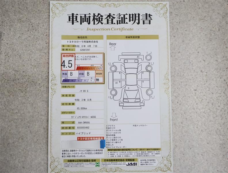 詳細及び現状の車両状態につきましては、店舗スタッフまでお尋ねください。 - 注2)上記と同様の評価点・状態表を「車両検査証明書」として店舗の展示車両に搭載しております。