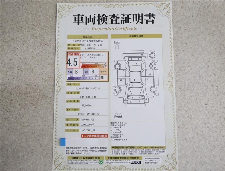 詳細及び現状の車両状態につきましては、店舗スタッフまでお尋ねください。 - 注2)上記と同様の評価点・状態表を「車両検査証明書」として店舗の展示車両に搭載しております。